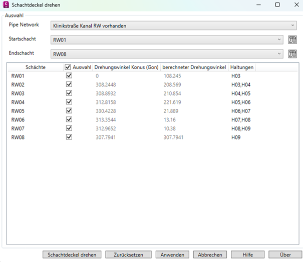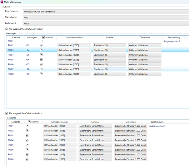 Eine Material- und Dimensionsänderung kann für ausgewählte Schächte und Haltungen als Massenbearbeitung anhand der Materialien in einer Komponentenliste durchgeführt werden.
