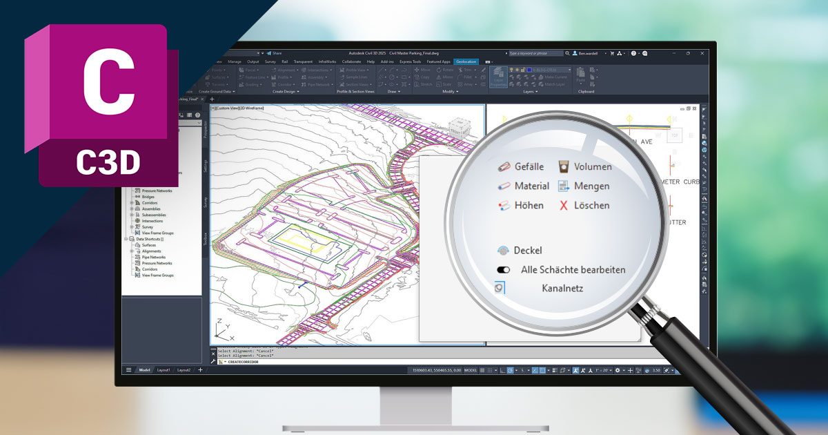 Kennen Sie die Kanalnetzänderungen aus dem Country Kit für Autodesk Civil 3D? Mit dem Zusatzprogramm können Höhen, Materialien und Dimensionen von Schächten und Haltungen über eine Massenbearbeitung geändert werden. Die Änderungen basieren auf den im Projekt hinterlegten Informationen zu den Schächten bzw. Haltungen. Gegenüber früheren Versionen hat sich vor allem die Benutzerfreundlichkeit verbessert, um das Kanalnetz sowie die Start- und Endschächte auszuwählen.
